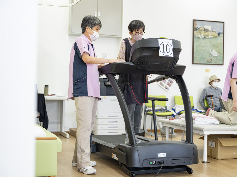 職員が付き添いでマシンを使用しながら運動を行います。他にも生活運動訓練として肋木や滑車、階段昇降などを使った運動も行っております。